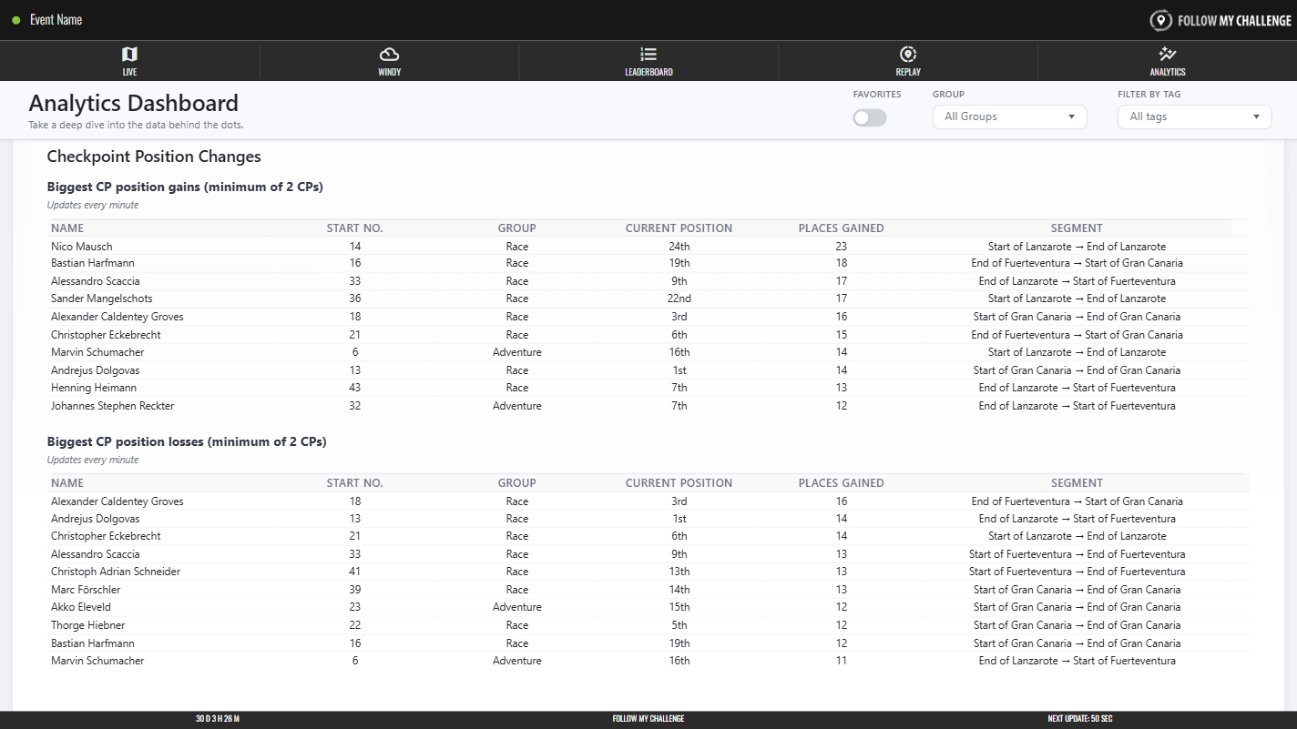 This metric is more useful for free route events, where positions only update at checkpoints. It highlights participants who have have risen substantially up the rankings, as well as those who have dropped down significantly. And it pinpoints where these changes occurred during the event.