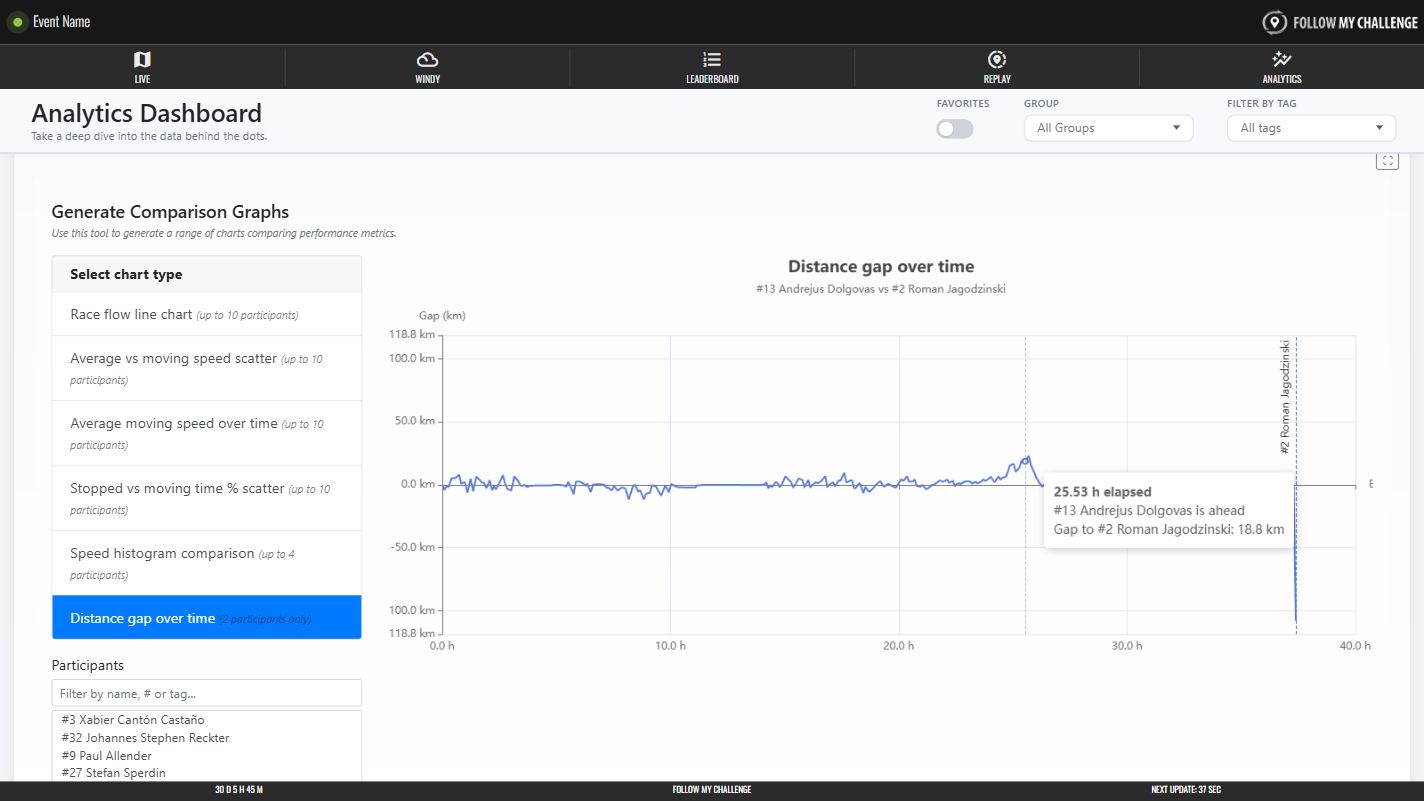 Graphs generate as soon as a participant is selected. The race flow line chart is the default option. To switch graph, simply click one of the other option on the list.