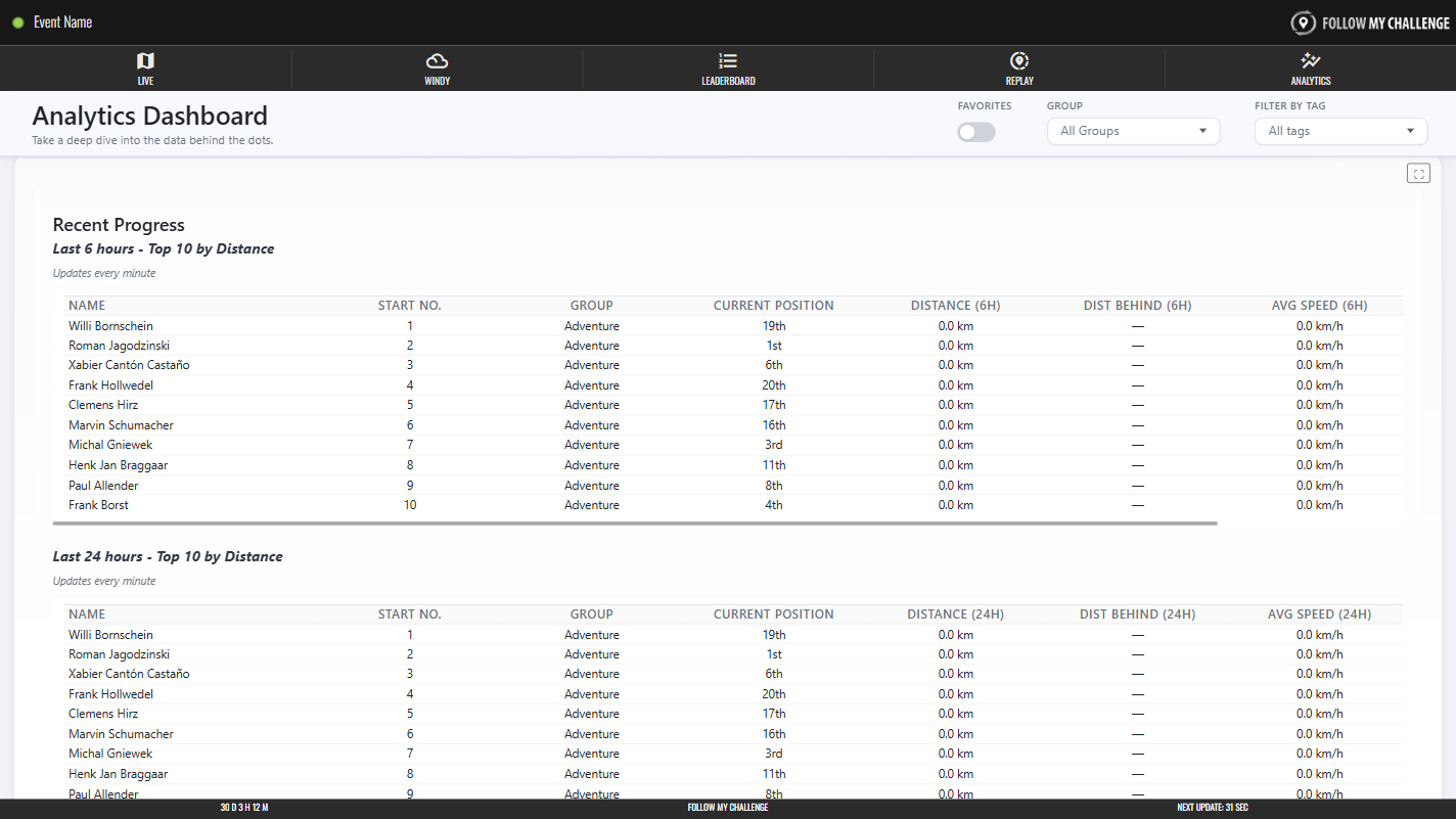 The recent progress section displays participants with the greatest distance covered over two time periods: the last 6 hours and the last 24 hours.