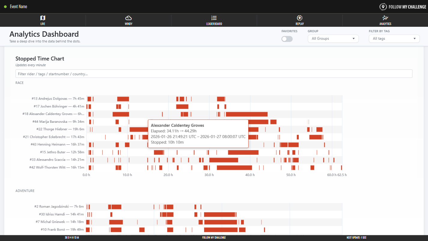 The stopped time section shows time stationary for participants laid over a timeline of the event so far. Any time stopped shows as a solid red bar, with longer stops displayed as longer bars. You can hover/tap a bar to see the exact duration it represents.